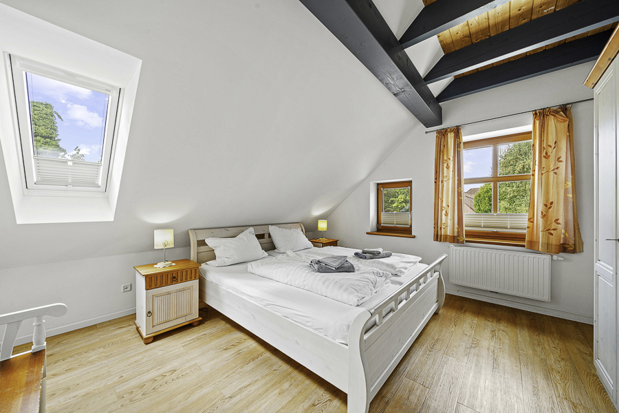 hat eine Wohnfläche von 90 m² und besteht aus einem großen Wohnzimmer mit Kamin, einer Essecke und moderner Einbauküche, zwei Schlafzimmern mit TV und zwei Badezimmern (Dusche und Badewanne).